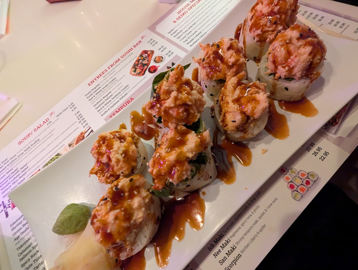 Twenty pieces of sushi, Philly maki, unagi maki, spicy California, spicy yellowtail, king crab maki, & spider maki